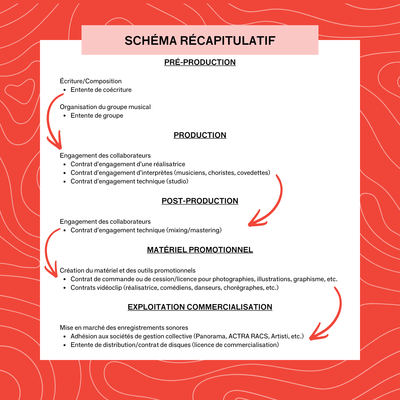 Le guide résume différents enjeux juridiques avec lesquels les artistes devraient se familiariser. Chaque concept est présenté à l'aide d'explications compréhensives mais concises, souvent accompagnées de tableaux ou de listes aide-mémoire qui récapitulent efficacement les notions à retenir.